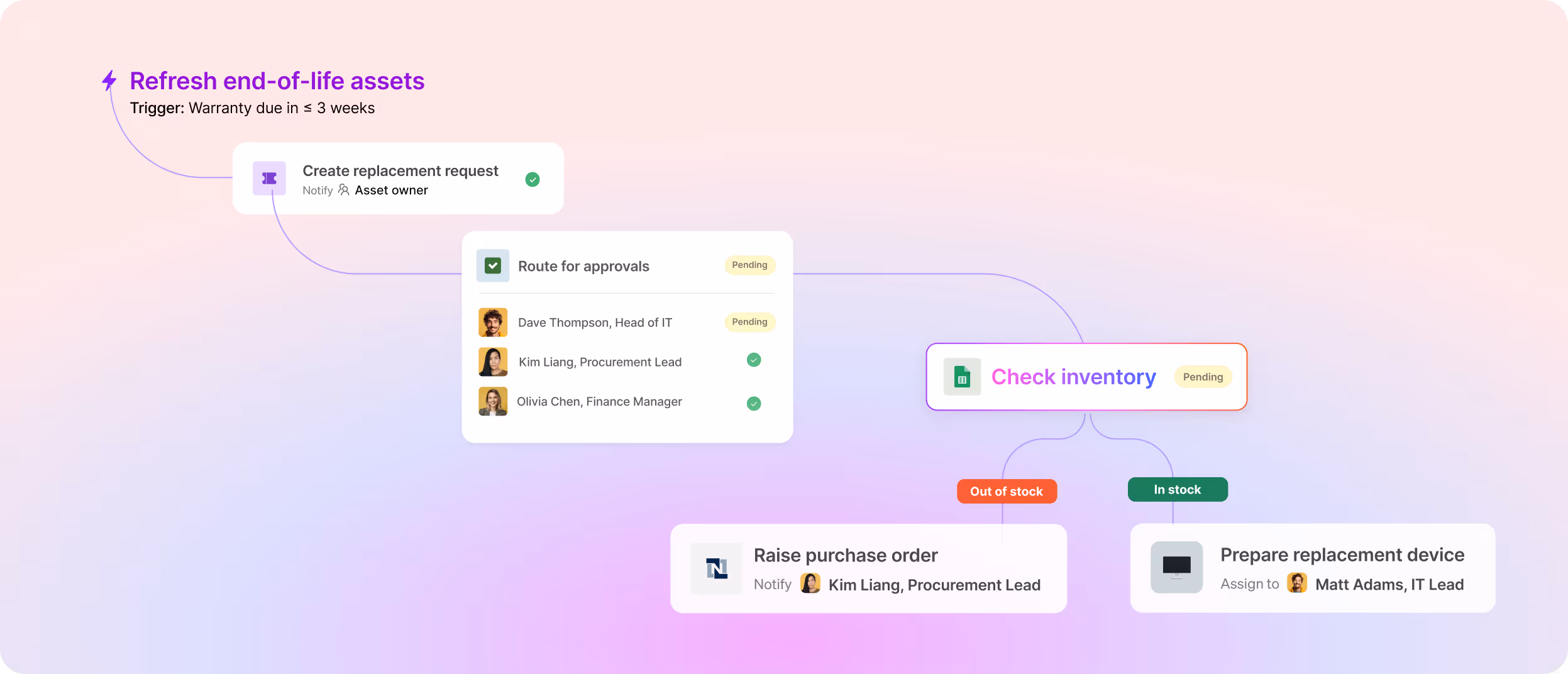 Automate routine IT asset management tasks like asset enrolment, replacement, or disposal with intelligent workflows.