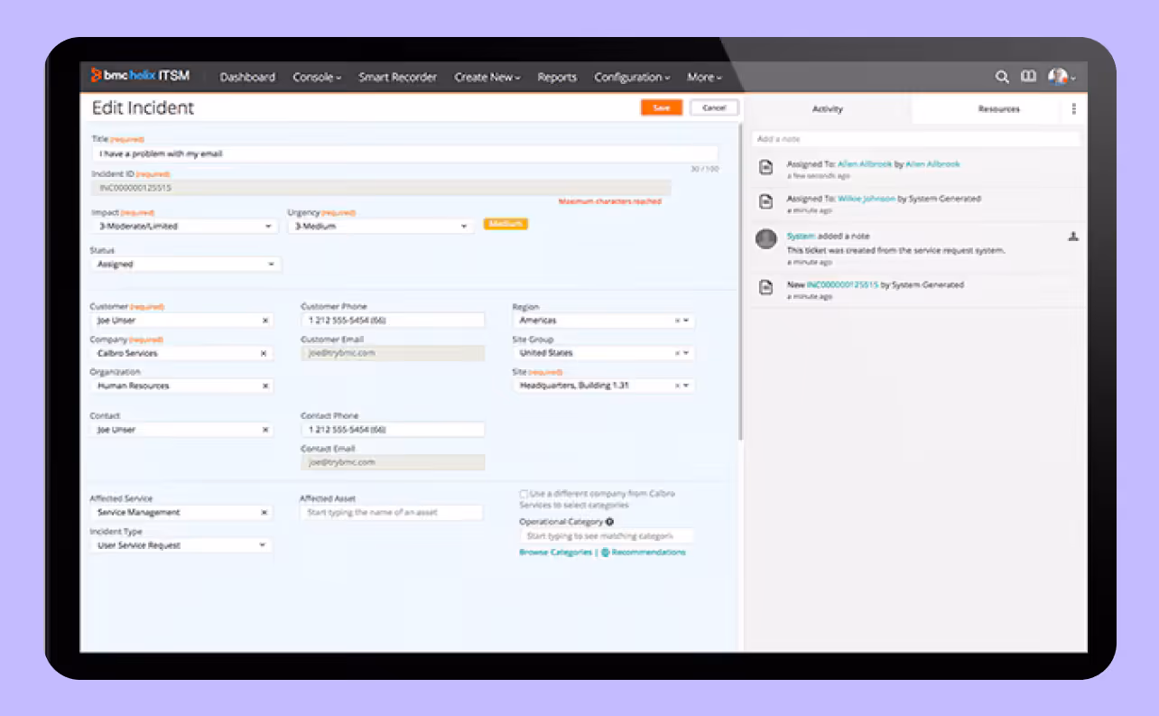 BMC Helix ITSM is one of ServiceNow’s closest legacy counterparts, built for large enterprises with complex, global IT environments. It delivers a comprehensive suite covering incident, change, asset, and service management, backed by deep ITIL process support.