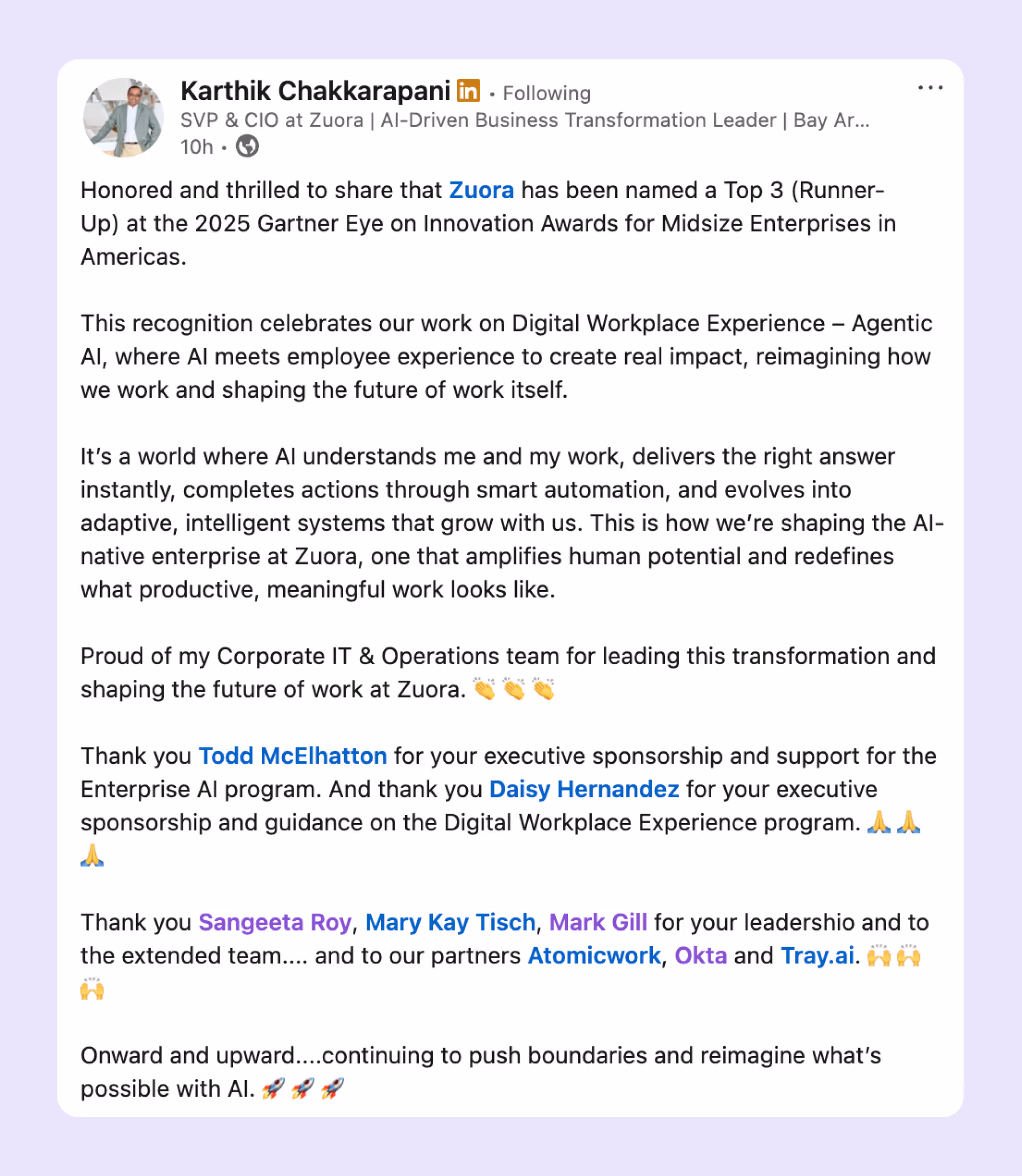 Karthik and his team needed to rethink how to simplify their tech stack, remove friction and let employees focus on high-impact work. In fact, their strategic move to transform the digital workspace experience with technology partners like Atomicwork, Okta, and Tray, earned them a spot on the '2025 Gartner Eye on Innovation Awards' within a year of implementation.