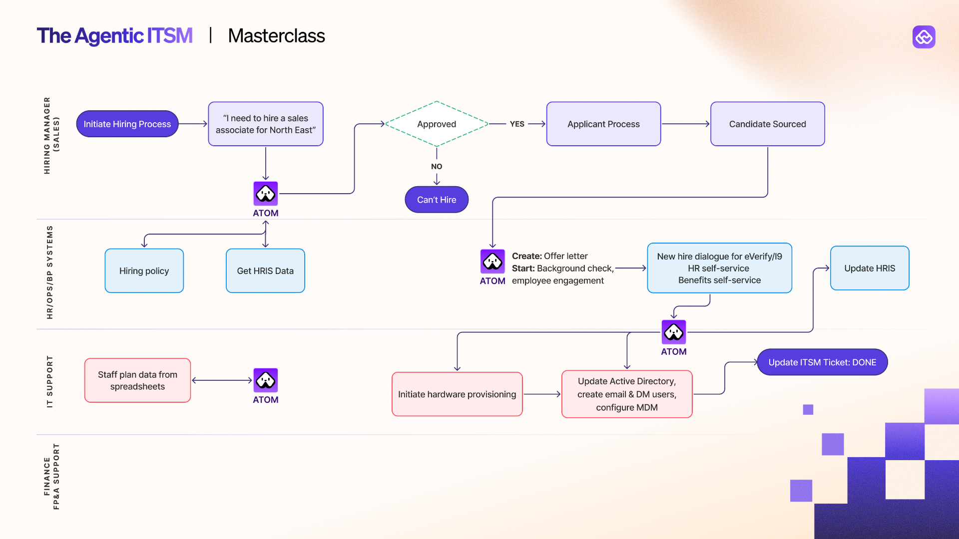 John opened with a detailed flow chart of the onboarding process, and the first thing that hits you is the number of swim lanes: hiring manager, HR ops, IT support, and finance. Each one has its own systems of HRIS, applicant tracking, identity management, CRM, FP&A tools and they're all designed to serve their respective organizational unit.