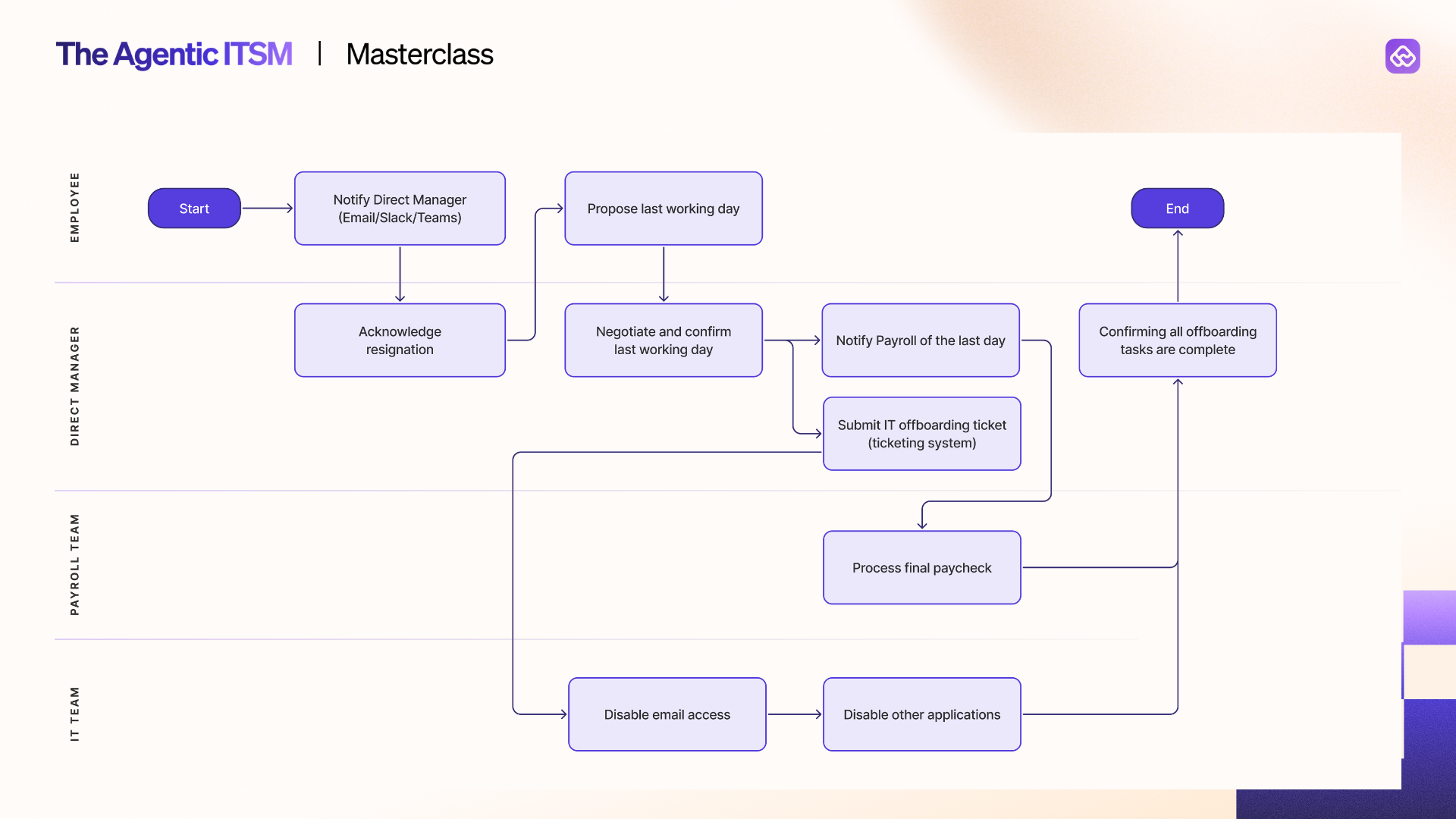 The session didn't stop at onboarding. John walked through the offboarding process, distinguishing between voluntary and involuntary terminations. Voluntary is relatively straightforward. Involuntary is where it gets sensitive when you can't revoke access or update systems before the termination meeting and without tipping off the employee. That requires careful, back-channel coordination that today happens entirely through unstructured messages.