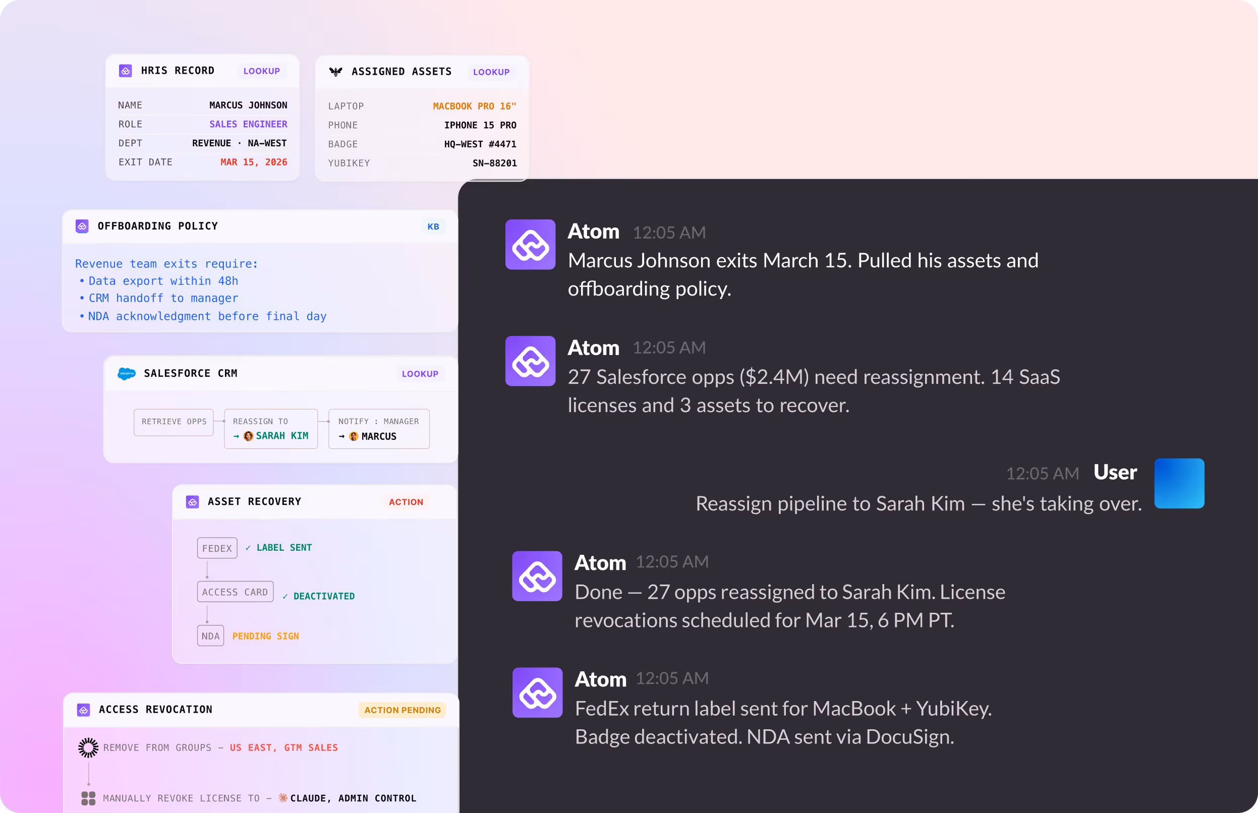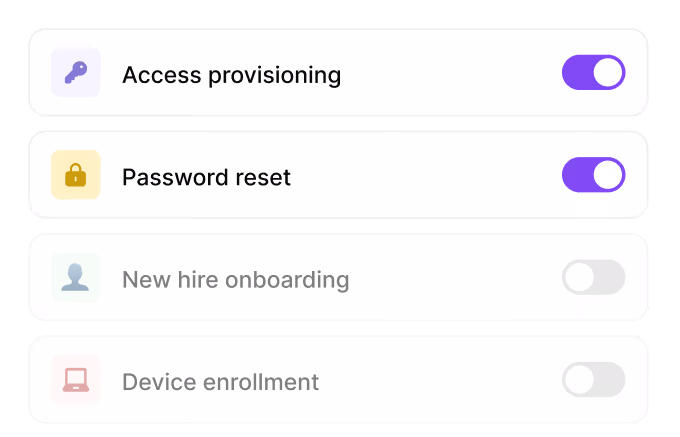 From access provisioning to policy updates, let agents handle full workflows—reducing ticket volume and response time without human handoffs.