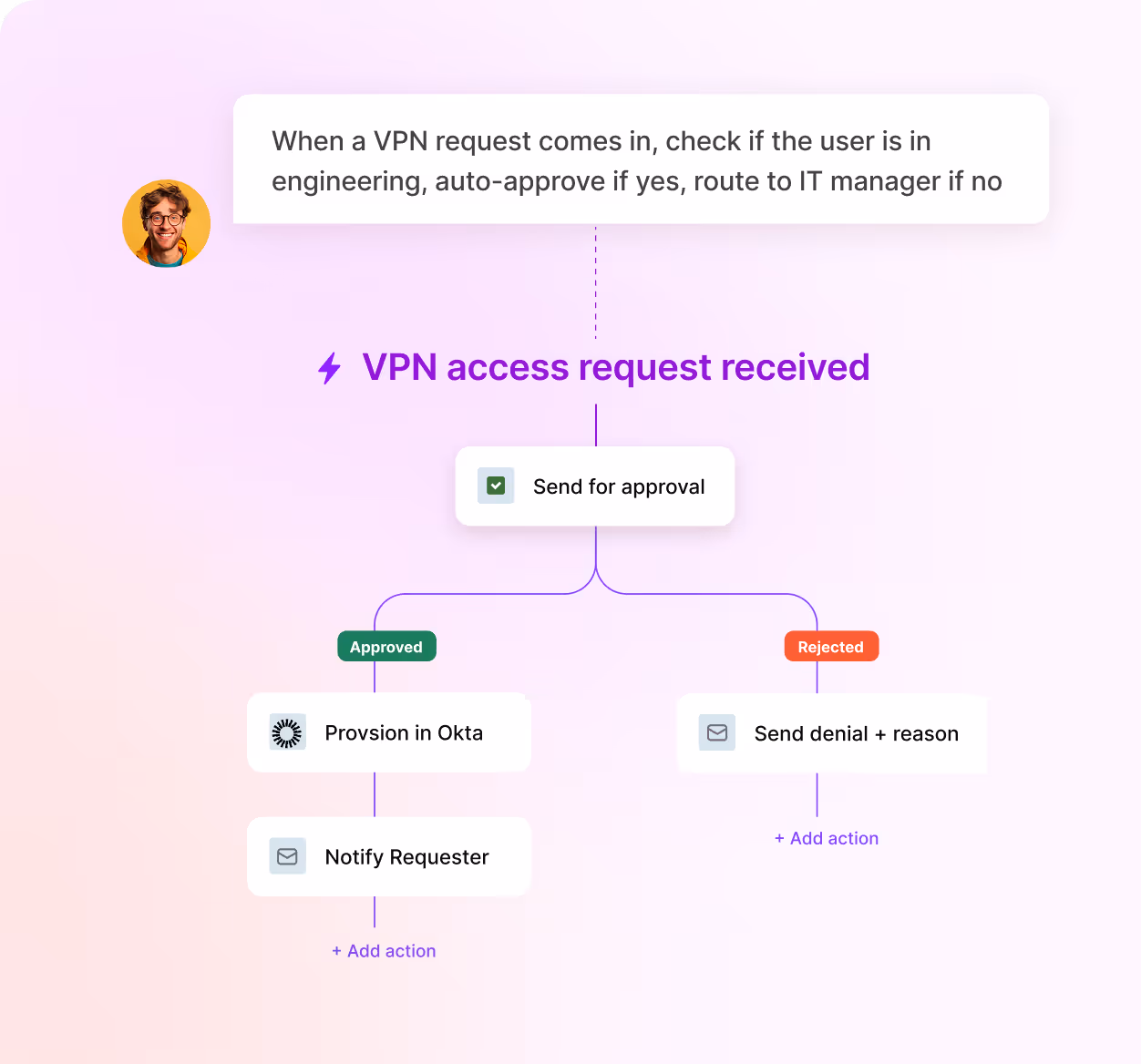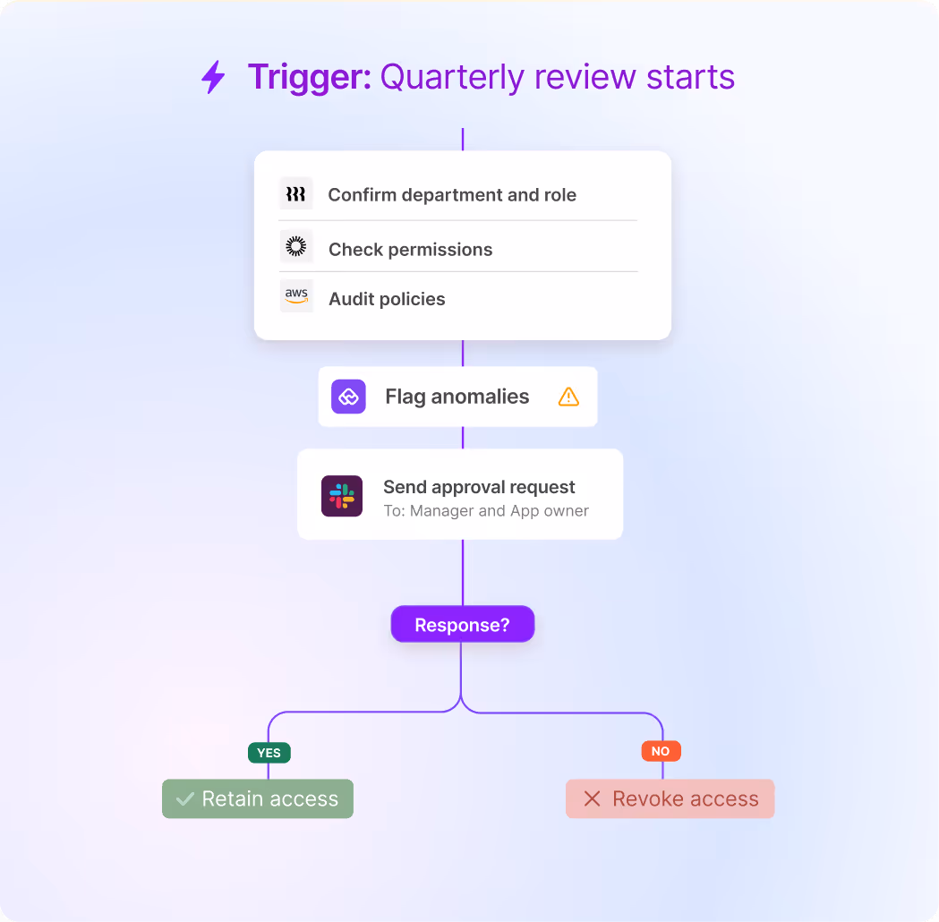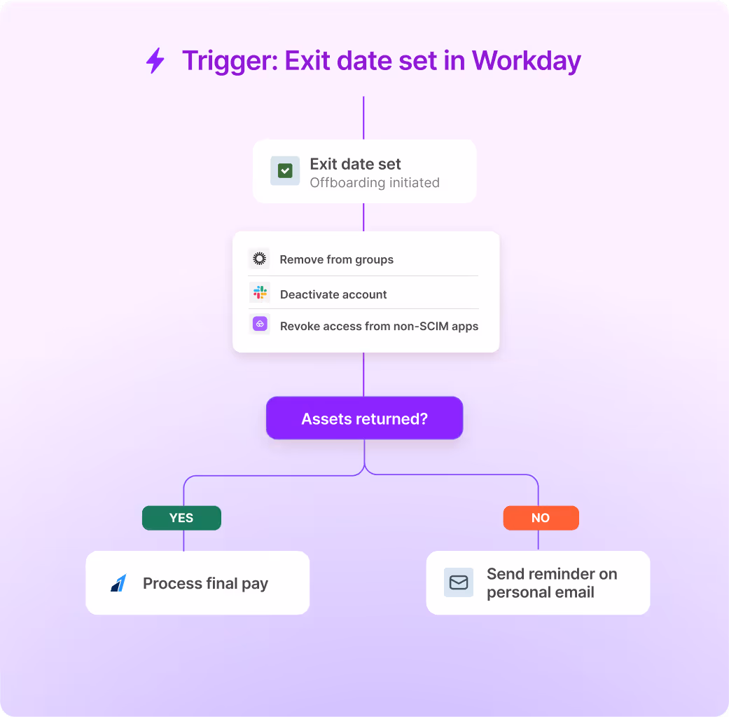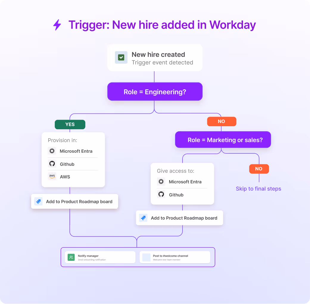 Know who’s asking, what applies to them, and take action across Okta, Workday, Jira, and 100+ apps.