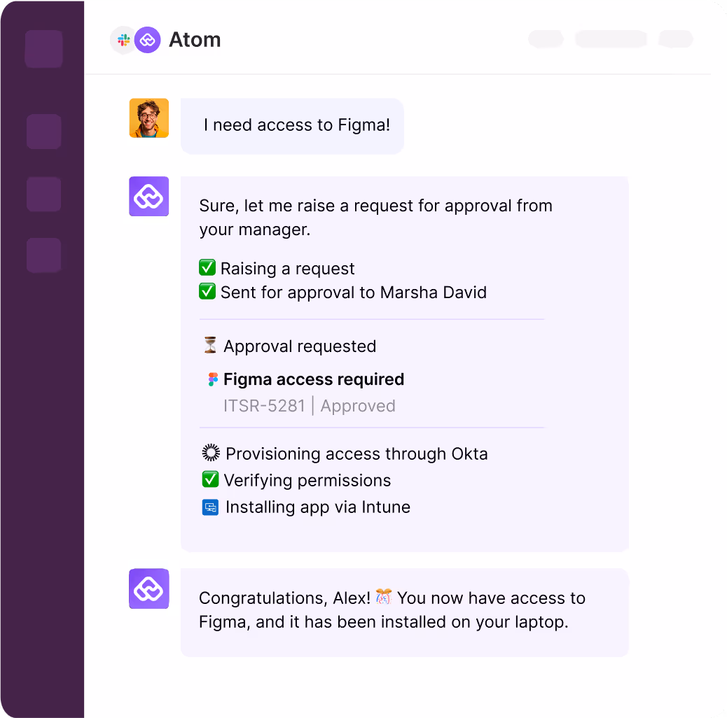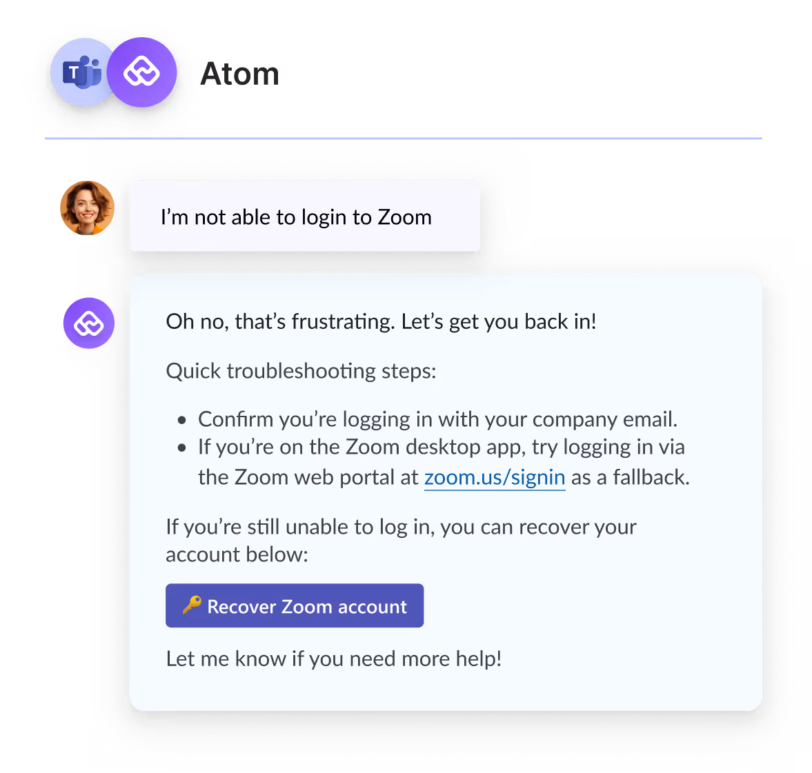 Atomicwork is an AI-powered service management platform that can be used by IT, HR, Finance and other internal teams to support employees. Employees can find answers, request for help and get support through an AI Assistant in Slack and Microsoft Teams.