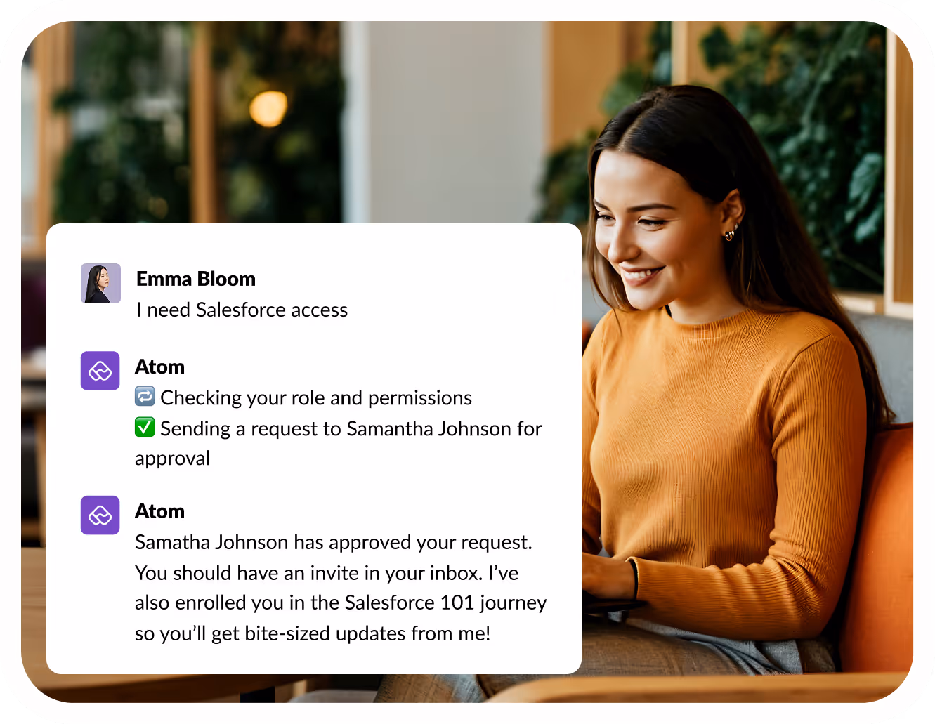 Employees can chat naturally with Atom in Slack or Teams to understand context, execute tasks, and provide instant help.