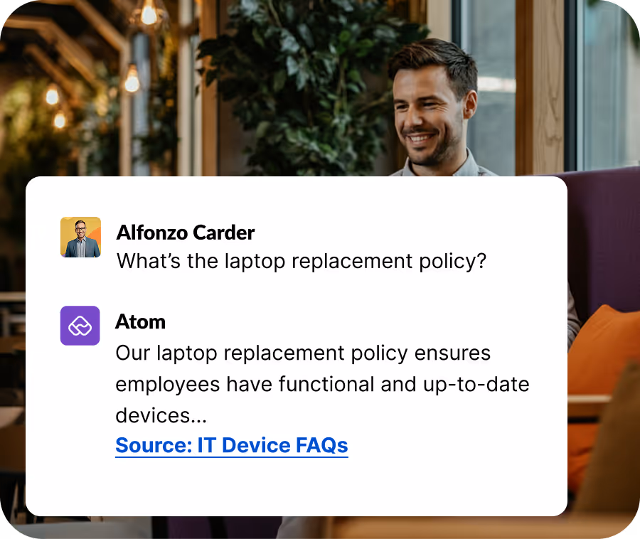 Our AI agents continuously learn from the organization's documentation, wikis, and approved responses, ensuring employees receive accurate, verified information with clear source citations. As your policies and procedures evolve, Atom updates its knowledge in real-time, supporting teams across languages and regions.