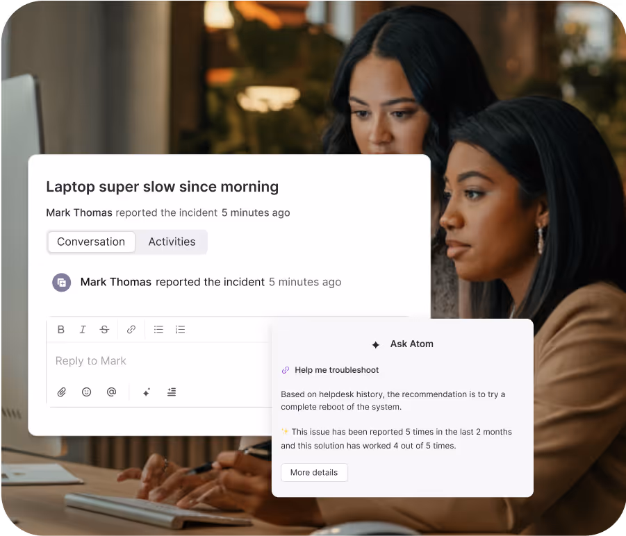 Atom acts as a smart assistant to your IT support team. It summarizes long service requests for quick understanding, identifies similar past incidents for faster resolution, and helps draft professional responses.