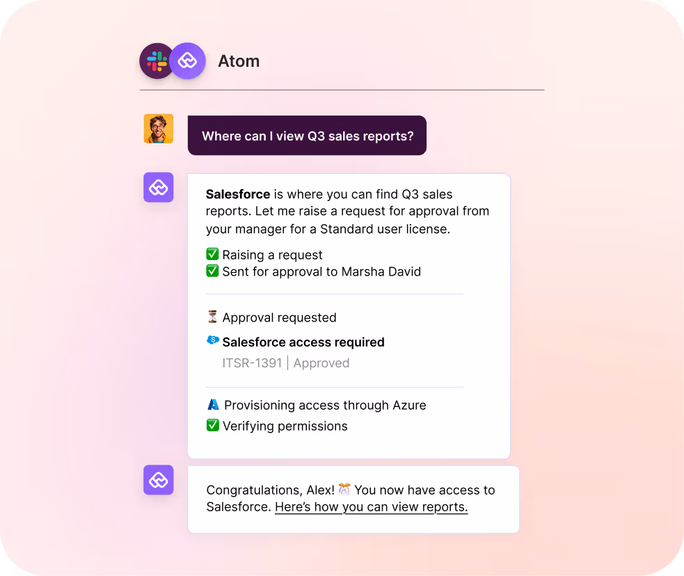 Atom, the Universal Agent, intelligently provisions access and handles approvals in the flow of work - eliminating the #1 source on IT ticket volume.